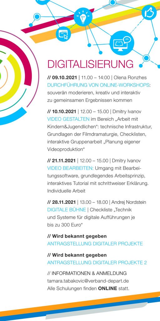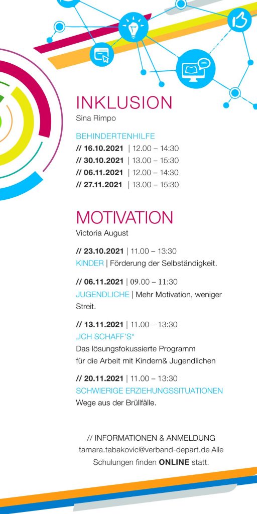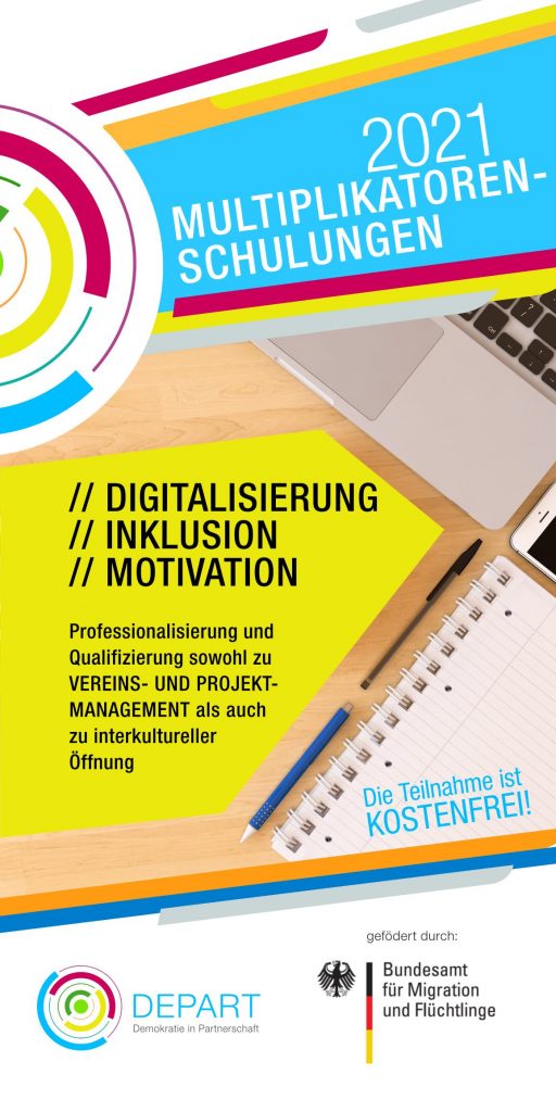 Im Herbst 2021 bot DEPART – Demokratie in Partnerschaft eine umfassende Schulungsreihe für Multiplikator:innen in der Vereins- und Projektarbeit an. Die kostenlosen Online-Workshops richteten sich an Fachkräfte, die mit Kindern und Jugendlichen arbeiten, und fokussierten sich auf drei zentrale Themenbereiche: Digitalisierung, Inklusion und Motivation.